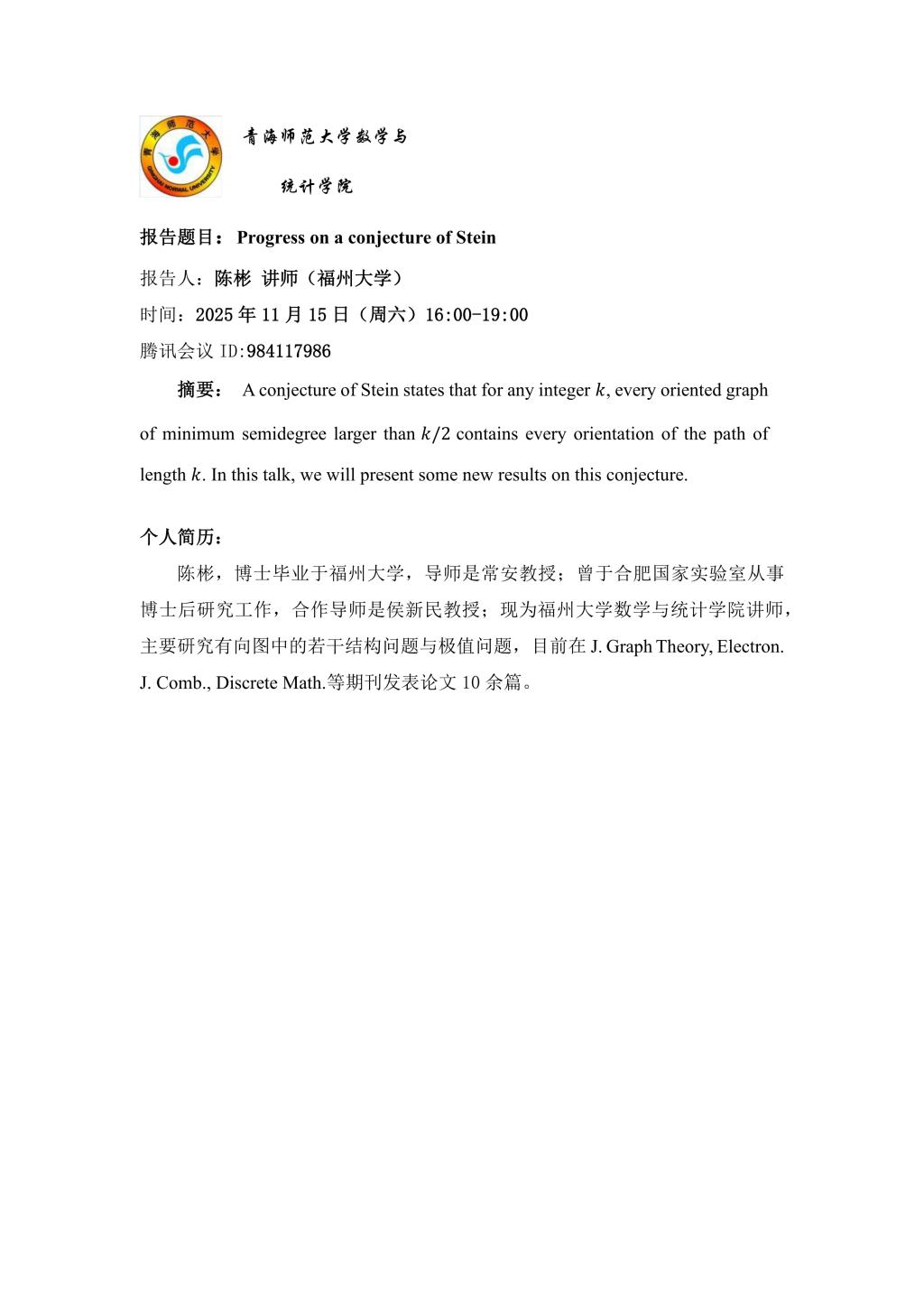 讲座(在线):11月15日 陈彬 Progress on a conjecture of Stein