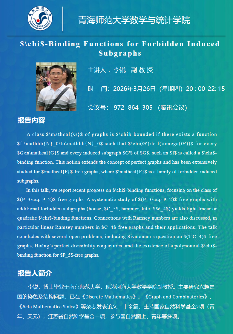 讲座(在线):3月26日 李锐 $\chi$-Binding Functions for Forbidden Induced Subgraphs
