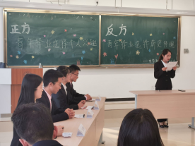 本场辩论赛的辩题以青年择业为主题,正方以"选择个人兴趣"为观点,反方以“选择薪资待遇”为观点。主席简单介绍评委嘉宾和两方辩手后,比赛即开始了。双方的开篇陈词都十分犀利,评委嘉宾都被他们的气势和精彩言论所吸引。双方的二、三辩也将攻辩阶段打得十分有激情,他们抛给对方双关性比较强的难题,回答对方的问题也是临危不惧,看来准备都十分充足,应变能力也十分了得。而最激情四射的还是自由辩论环节莫属了,两方辩手据理力辩、你推我挡,既激情盎然又从容不迫,而台下观众们也听得热血沸腾,恨不得上台同辩手们争个雌雄。特别是两方二辩,他们声音洪亮,思维慎密,逻辑能力很强,那些听似刁钻的问题对于她们来说简直是易如反掌。观众们还未尽兴,自由辩论环节就结束了。双方四辩的总结陈词不仅指出对方在比赛过程中暴露的问题,还分点论述更加强了自方的观点。比赛结束后,评委代表们细评了各方的优点和不足,肯定了辩论过程中一些精彩之处,也惋惜在自由辩论阶段中一些暴露出来却没有被提出的论点,整场比赛都被评委们剖析的精细而准确。通过评委团的讨论,反方荣获总冠军,双方最佳辩手分别是反方二辩和正方二辩,并有评委给他们颁奖。