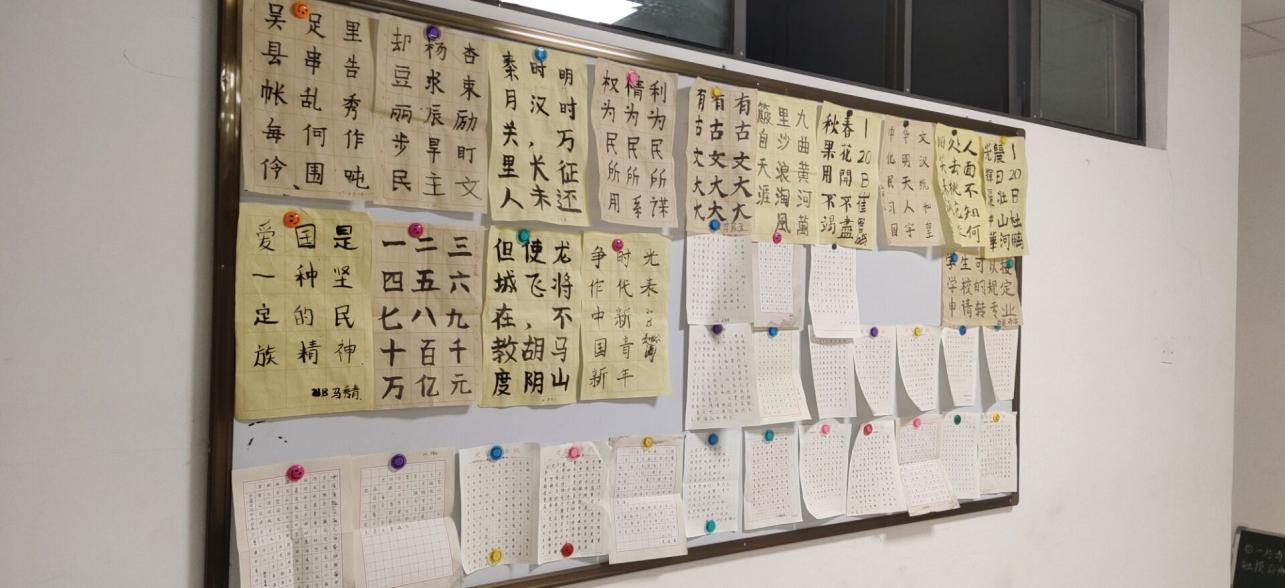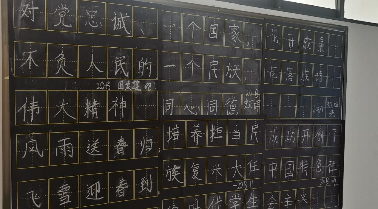 通过展示,本月20B与21B班的进步较大,展示效果较好,20A与21A班的展示中粉笔字和毛笔字有待改进,积极性有待提高。通过集中展示,将好的作品作为典型展示,供同学们观摩学习,共同进步。