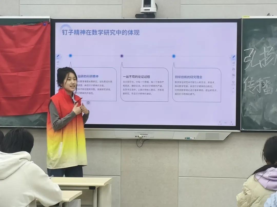 从革命战争年代,数学家们运用数学原理助力军事战略布局,如精准计算炮弹轨迹、规划行军路线,到和平建设时期,数学在红色根据地经济发展、资源合理调配中发挥的关键作用,志愿者们都进行了细致入微的讲解。为了让同学们更好理解,他们还穿插讲述了许多鲜为人知的红色故事与数学革命家,把那些蕴含在数字与公式背后的热血与奉献,生动地呈现在同学们眼前。