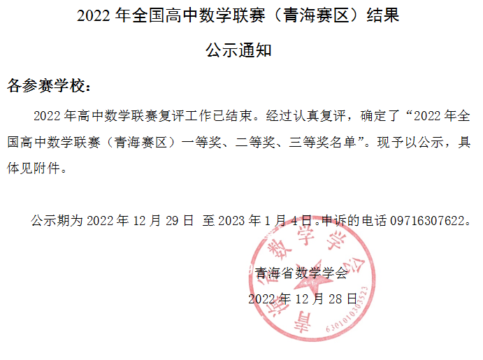 2022年全国高中数学联赛(青海赛区)结果公示