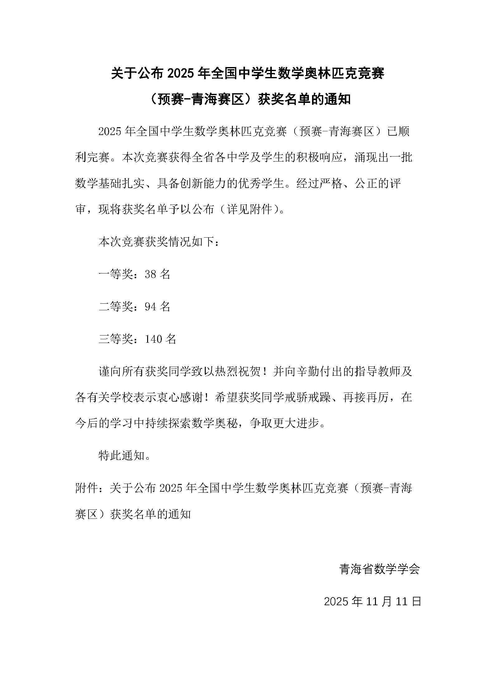关于公布2025年全国中员工数学奥林匹克竞赛(预赛-青海赛区)获奖名单的通知
